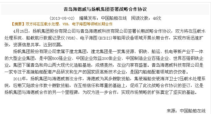 中國船舶在線:青島海德威與揚帆集團簽署戰(zhàn)略